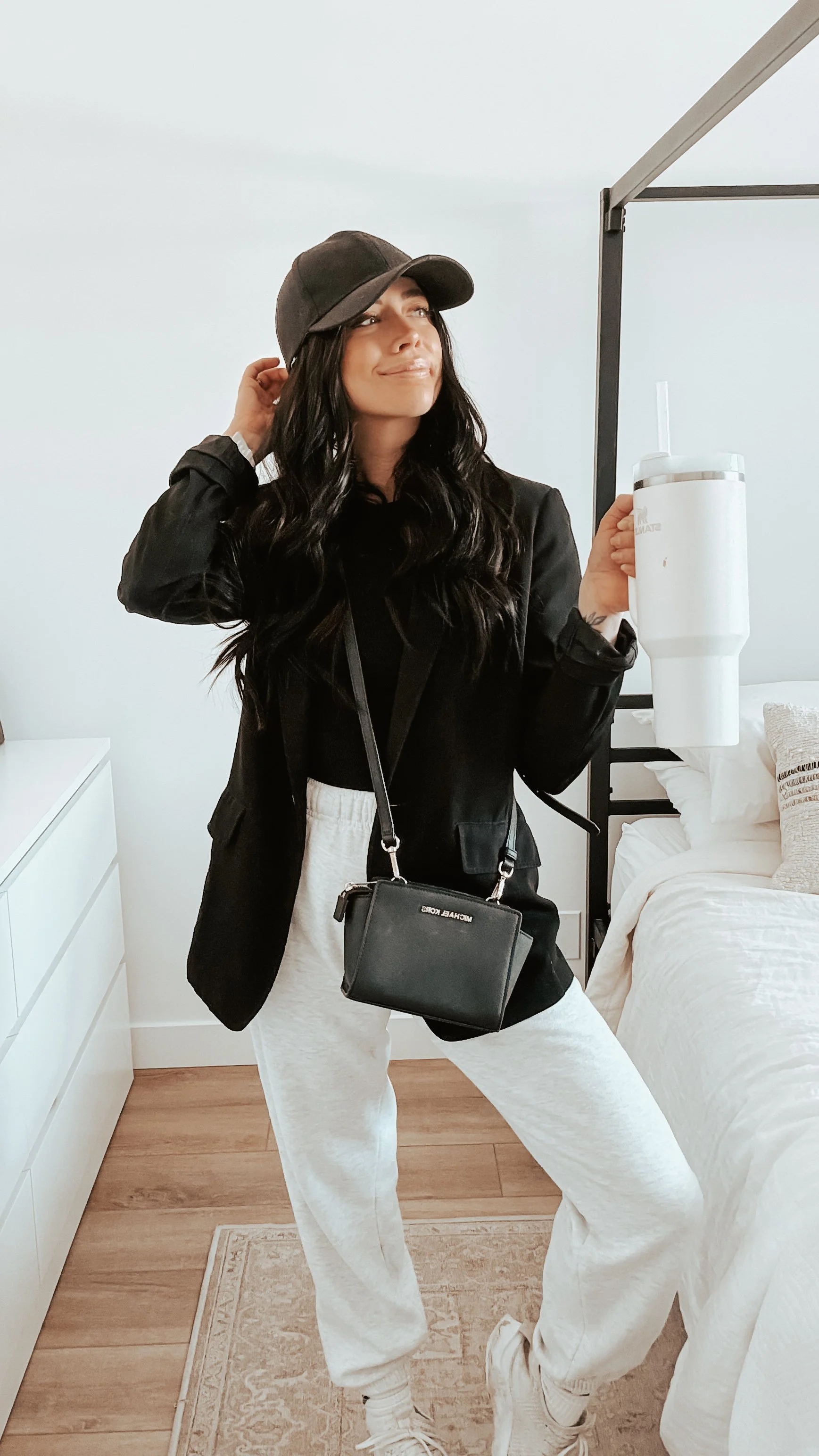 Black cap + black blazer + black tee + side bag + grey sweats + white socks + white sneakers