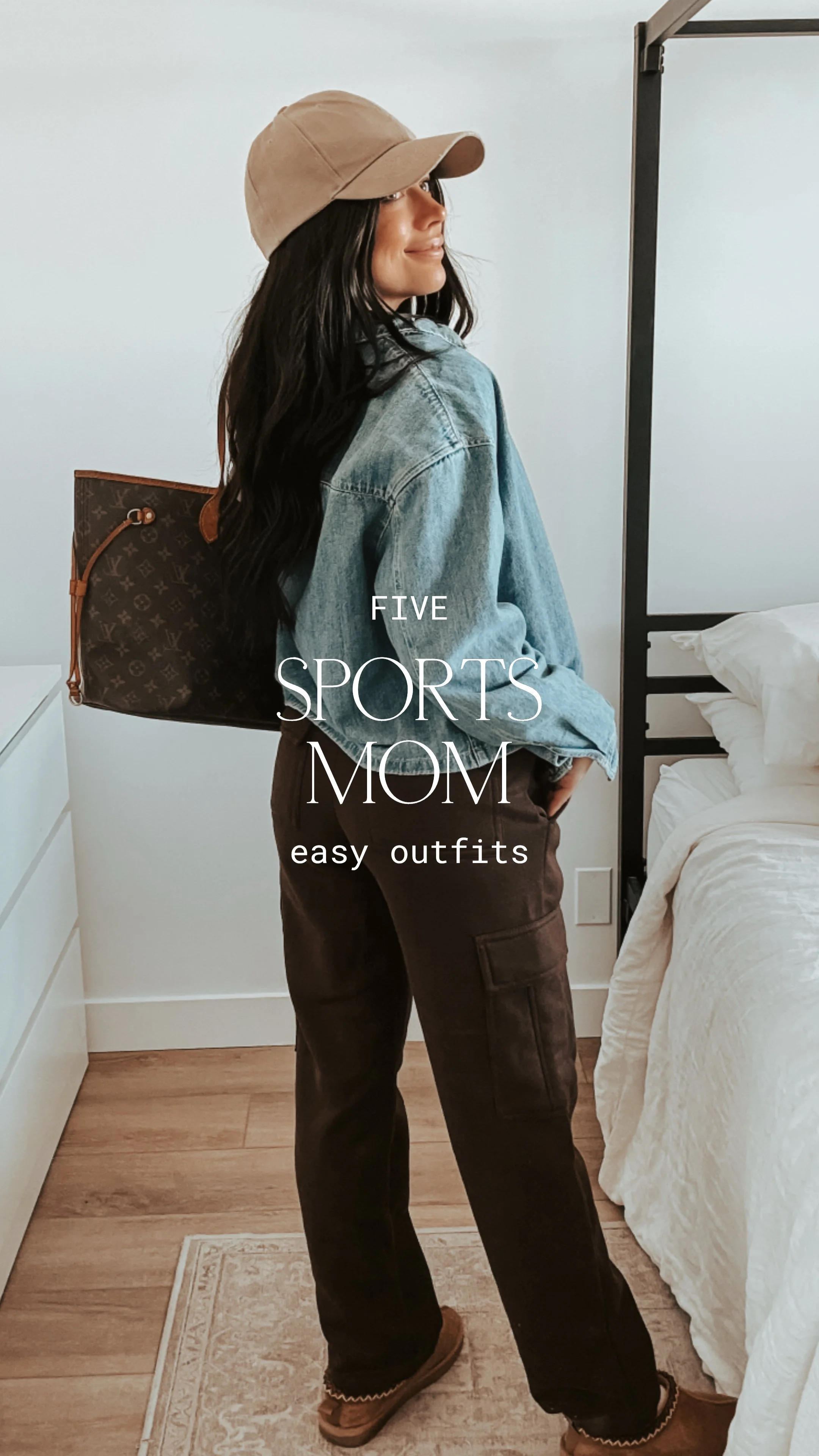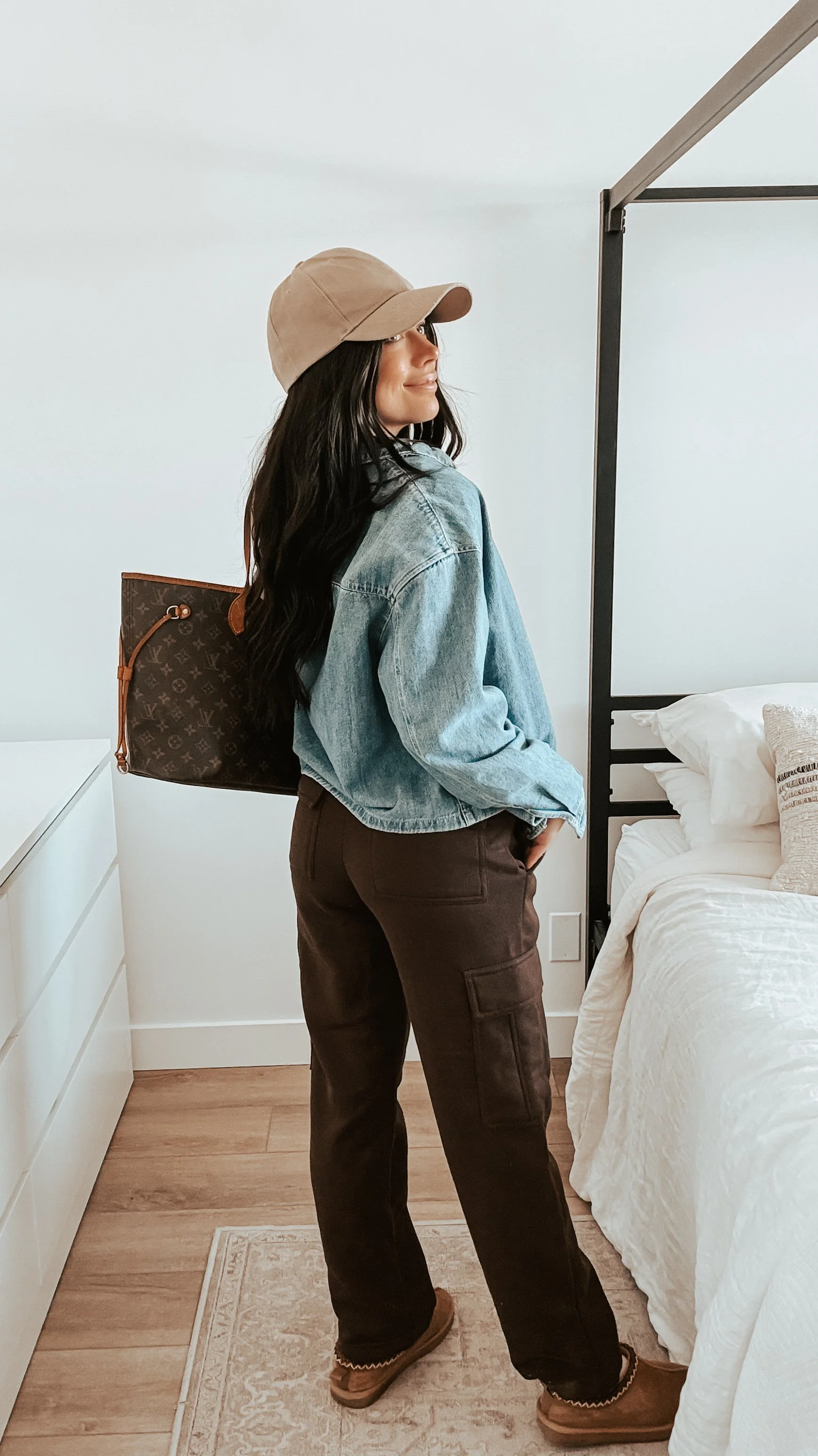 The denim button-up instantly adds structure to soft cargo sweats, and the beige cap keeps it effortless. UGGs are non-negotiable for cold mornings, and the oversized tote fits everything — snacks, water bottles, extra layers.